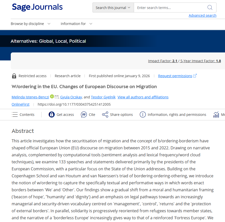 This article investigates how the securitisation of migration and the concept of b/ordering-borderism have shaped official European Union (EU) discourse on migration between 2015 and 2022. Drawing on narrative analysis, complemented by computational tools (sentiment analysis and lexical frequency/word cloud techniques), we examine 133 speeches and statements delivered primarily by the presidents of the European Commission, with a particular focus on the State of the Union addresses. Building on the Copenhagen School and van Houtum and van Naerssen’s triad of bordering-ordering-othering, we introduce the notion of w/ordering to capture the specifically textual and performative ways in which words enact borders between ‘We’ and ‘Other’. Our findings show a gradual shift from a moral and humanitarian framing (‘beacon of hope’, “humanity’ and ‘dignity’) and an emphasis on legal pathways towards an increasingly managerial and security-driven vocabulary centred on ‘management’, ‘control’, ‘returns’ and the ‘protection of external borders’. In parallel, solidarity is progressively reoriented from refugees towards member states, and the narrative of a ‘borderless Europe’ increasingly gives way to that of a reinforced ‘Fortress Europe’. We argue that this evolving w/ordering does not merely describe migration but actively participates in legitimising new border infrastructures, surveillance practices and restrictive asylum policies. The article thus highlights the constitutive role of language in European border-making and the ways in which textual othering precedes and underpins physical bordering.