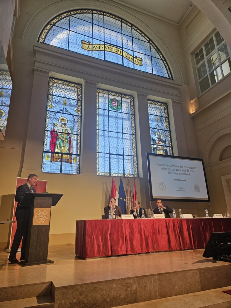 Daniel Klimovsky, a Comenius Egyetem Politikatudományi Tanszékének munkatársa arról beszélt, hogy újra kell gondolni a határon átnyúló együttműködés elemeit. Előadásában megvizsgálta e kezdeményezések céljait és tényleges igényeit. Kutatásában hangsúlyozta, hogy a projektek ritkán foglalkoznak valódi helyi igényekkel, és ritkán támogatják a működő helyi közösségeket. Következésképpen sürgősen újra kell gondolni a településközi együttműködést, és a bevett együttműködési kliséken túlmutató valódi igényeket kell azonosítani.
